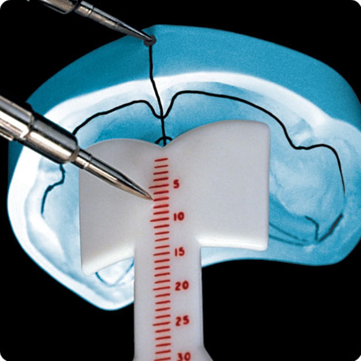 To obtain an exact as possible measurement, the patient should sit in an upright position. Then the Papillameter is carefully inserted vertically under the relaxed upper lip until it rests on the support at the Papilla Incisiva. For better approximation, this procedure should be repeated one to two times to achieve the best possible measurement result.